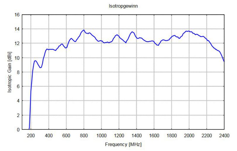 Linear polarized double ridged broadband horn antenna for receive and transmit applications made of aluminium. An optional 7-16 connector is available for high power applications. Frequency range 0.2 GHz to 2 GHz.